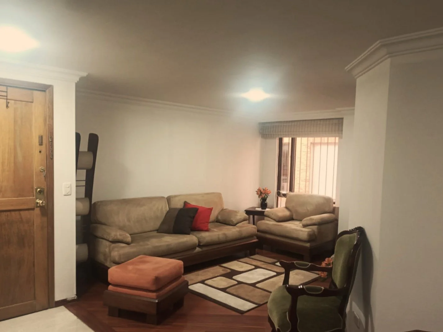 Al ingresar se encuentra un hall de recibo amplio, que comunica con la el comedor y la sala que son independientes. Desde este punto se accede a la cocina cerrada, la lavandería y el cuarto y baño del servicio.